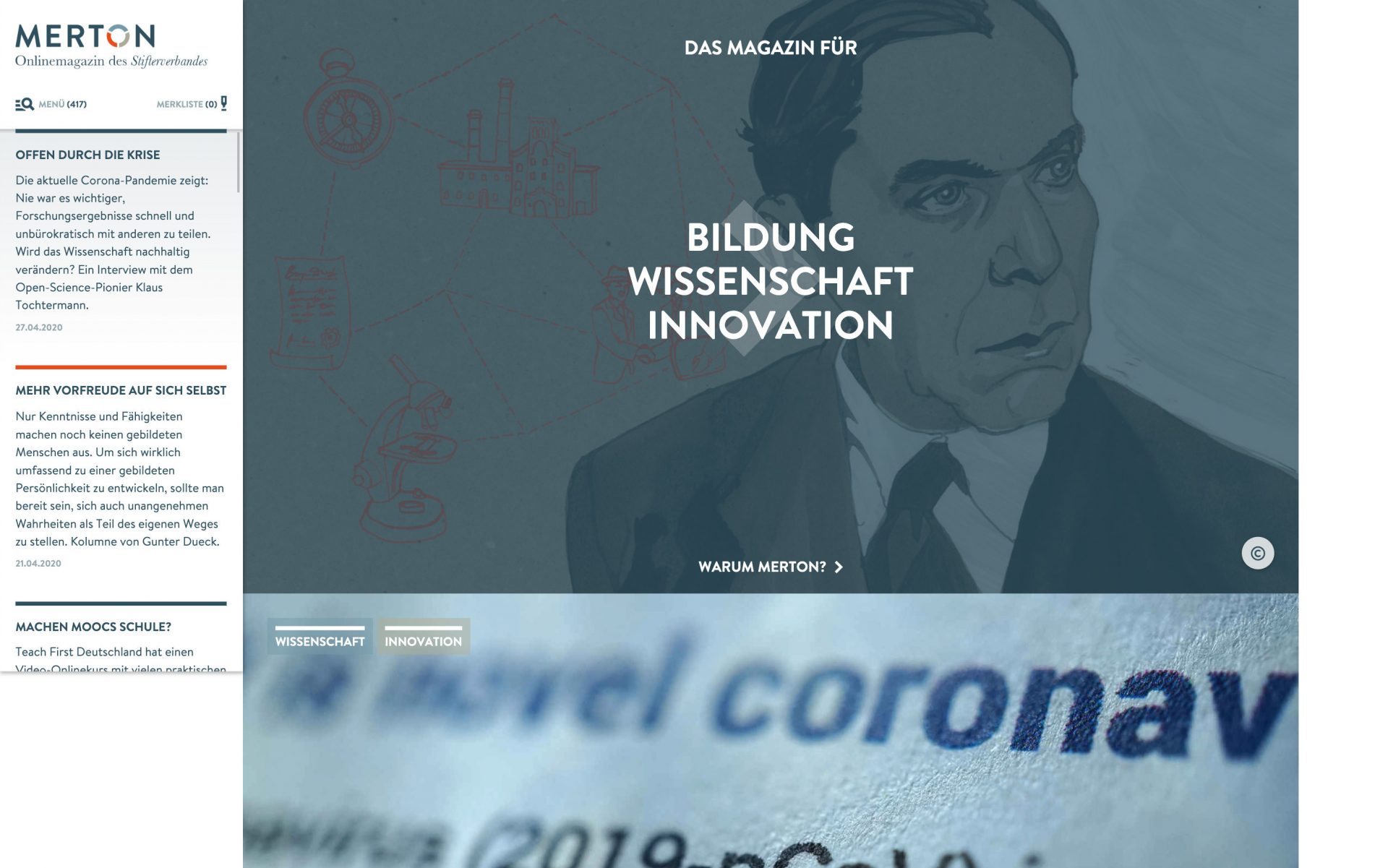 Das Onlinemagazin MERTON wurde entwickelt, das Inhalte aus den drei Aktionsfeldern des Verbands thematisiert: Bildung, Wissenschaft und Innovation. Der Fokus des neuen Mediums liegt auf dem Storytelling: In personalisierten Geschichten werden Themen des Stifterverbands journalistisch aufbereitet – intensiv recherchiert, spannend geschrieben und von Anfang an multimedial gedacht.