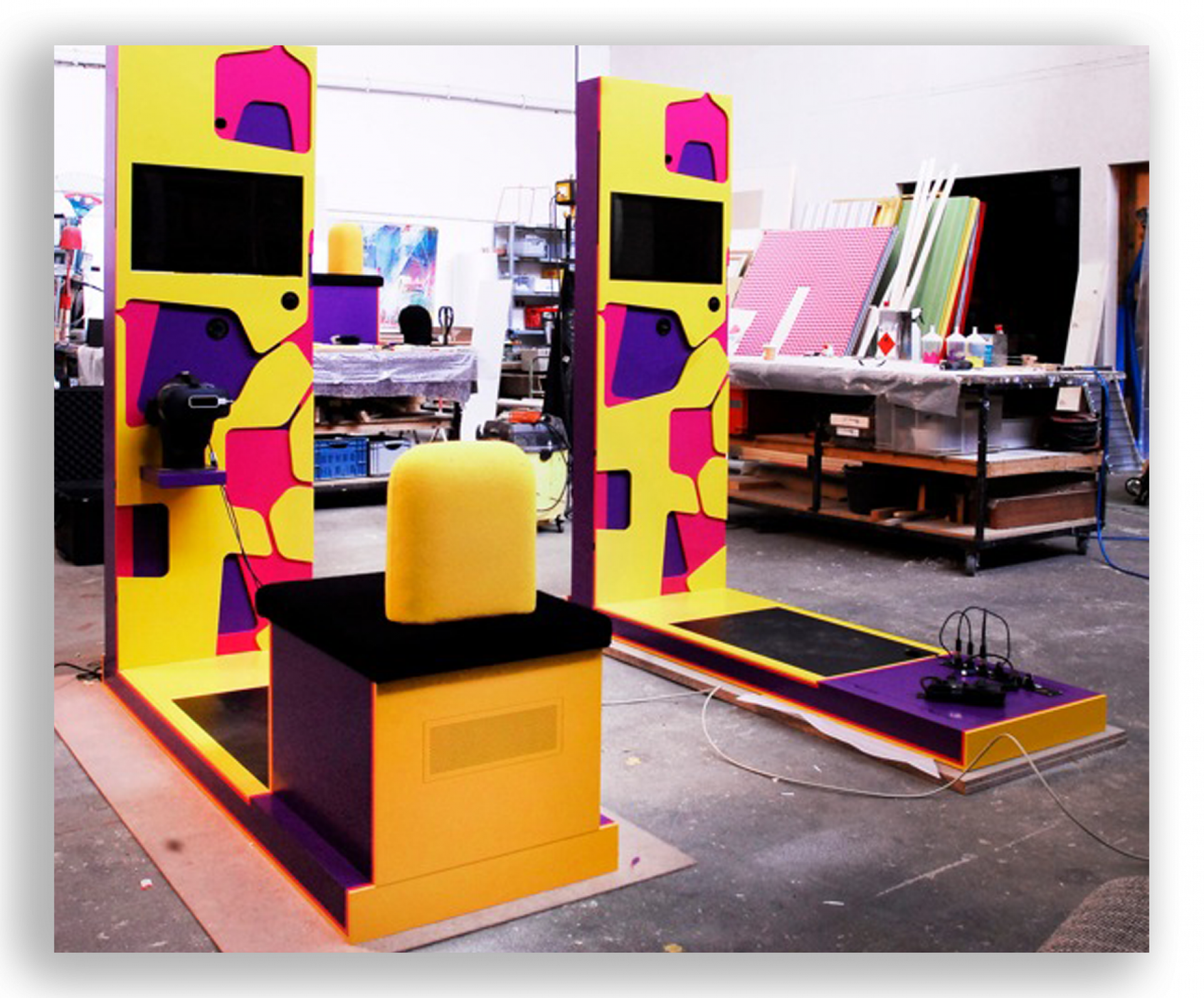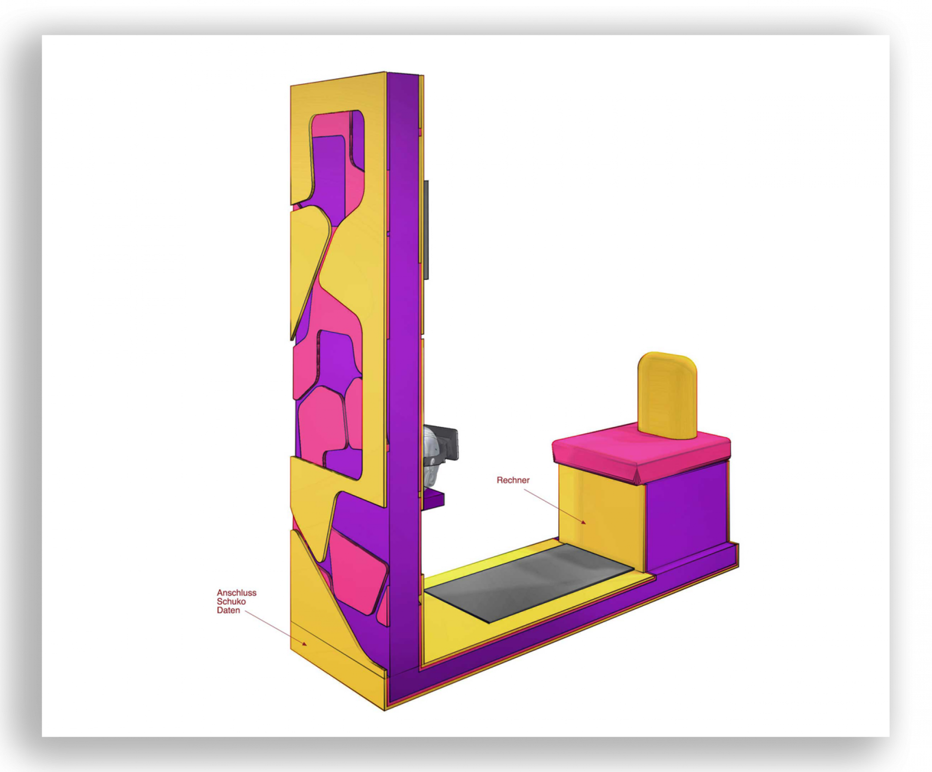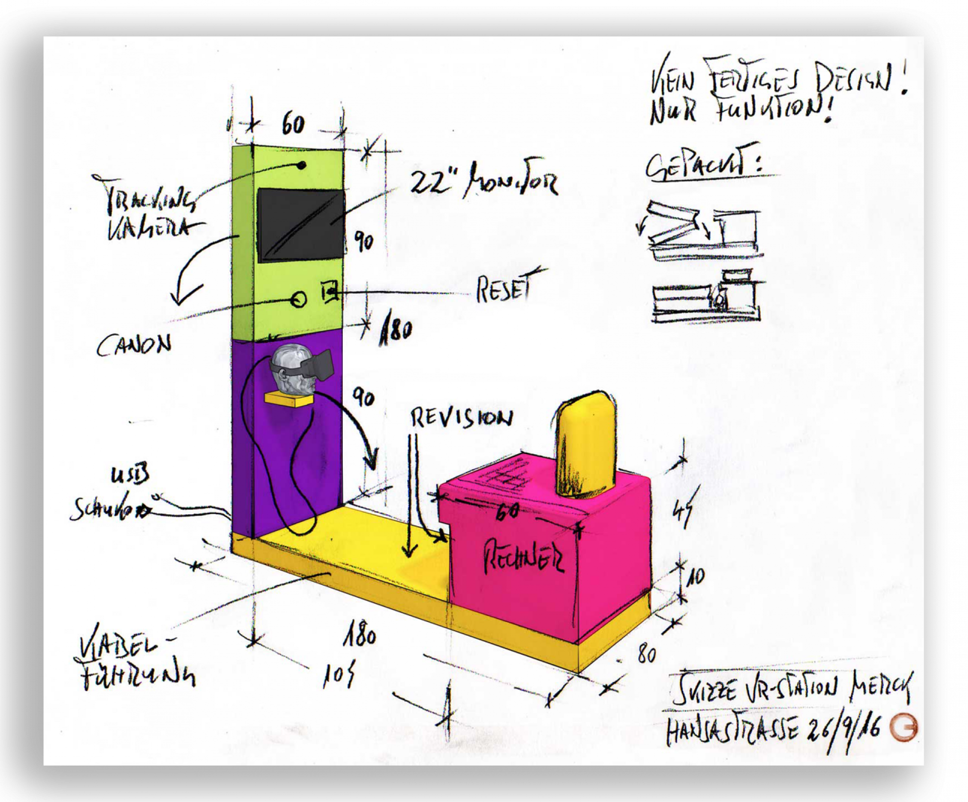 Die virtuelle Experience brauchte nicht nur einen Raum, sie sollte auch im Raum auffallen. Zum Beispiel bei Veranstaltungen auf dem Merck Campus oder auf Karrieremessen. Ole Grönwoldt gestaltet und baute uns das perfekte Möbel: Bunt, haptisch, praktisch und sicher (Stichwort "VR-Sickness"). Die Stehlen-artigen Stationen beinhalten die komplette Hardware, einen Bildschirm, die VR-Gear; und sie passen perfekt zur Marke. Sogar eine individuelle Transportkiste wurde eigens entwickelt. Neben den virtuellen Herausforderungen stellten uns vor allem Organisation und Logistik vor neue Herausforderungen: Denn über Zoll, Insektenschutz oder Stromnetze in den USA hatten wir bisher noch selten nachgedacht.